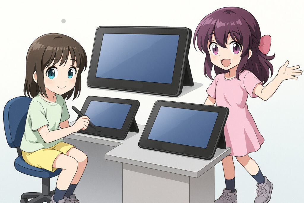 パソコン・液晶タブレット・ソフトを用意しており、デジタル作画ができます。